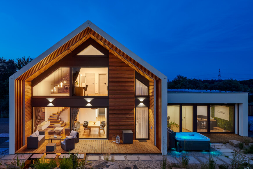 Velká okna, která propojují interiér s exteriérem, využití přírodních materiálů, jež utvářejí pověstné teplo domova, a důraz na komfort a funkčnost. Takto vypadá inovativní architektura v pojetí společnosti GOOPAN. Všechny nízkoenergetické či pasivní typové domy společnosti GOOPAN v podobě bungalovů i patrových domů si můžete prohlédnout zde.